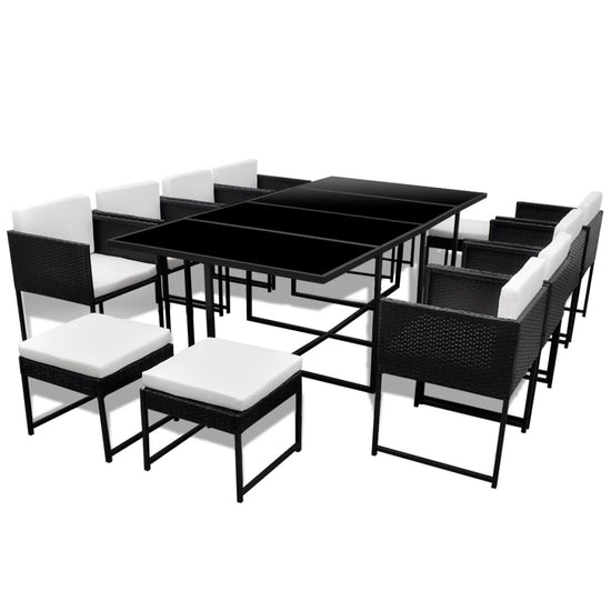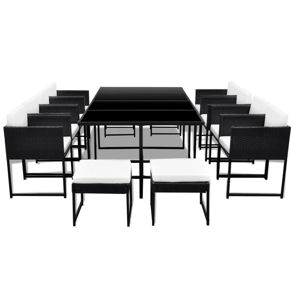 De levering bevat 1 tafel met glazen tafelblad, 8 rattan stoelen, 4 krukjes, 12 zitkussens en 8 rugkussens. Opmerking: wij raden aan de set af te dekken wanneer het regent, sneeuwt of vriest.