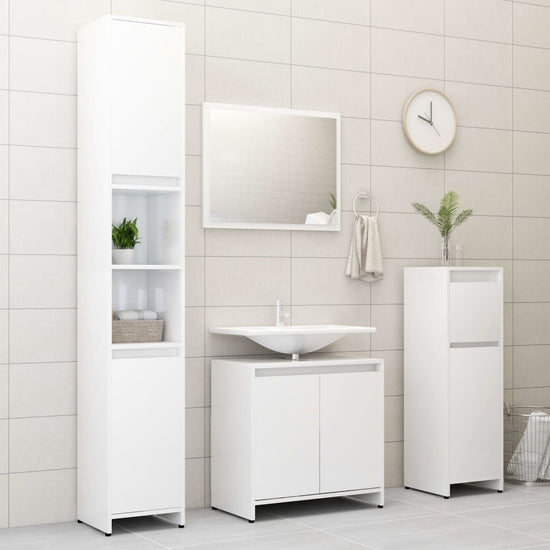 Deze trendy meubelset, bestaande uit 1 hoge kast, 1 medium kast, 1 wastafelkast en 1 spiegel, heeft een prachtige, nette uitstraling en creëert extra opbergruimte in je badkamer.