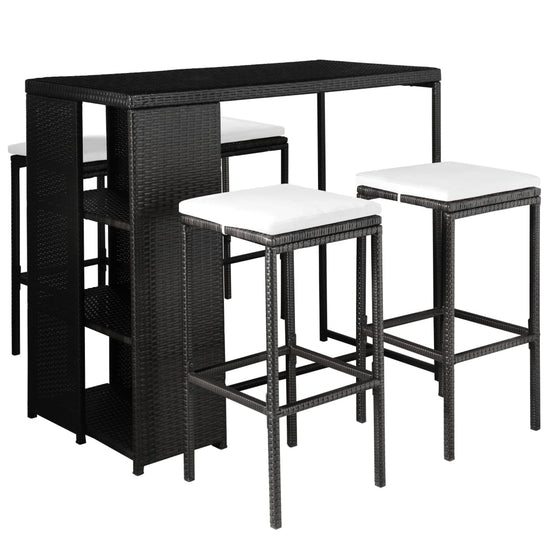 Deze poly rattan barset, bestaande uit 1 bartafel, 4 barkrukken en 4 zitkussens, wordt de blikvanger van je tuin.