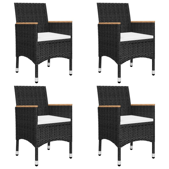 De eettafel is gemaakt van massief acaciahout met een olieafwerking, waardoor hij stabiel, duurzaam en gemakkelijk te onderhouden is. De eetstoelen hebben een gepoedercoat stalen frame bedekt met weerbestendig PE-rattan waardoor ze stevig en gemakkelijk schoon te maken zijn. Elke stoel is ontworpen met gebogen rug- en armleuningen voor een meer ergonomische vorm. De armleuningen zijn prachtig gedecoreerd met massief acaciahout voor een rustieke charme. De dik gevoerde kussens bieden ultiem zitcomfort.
