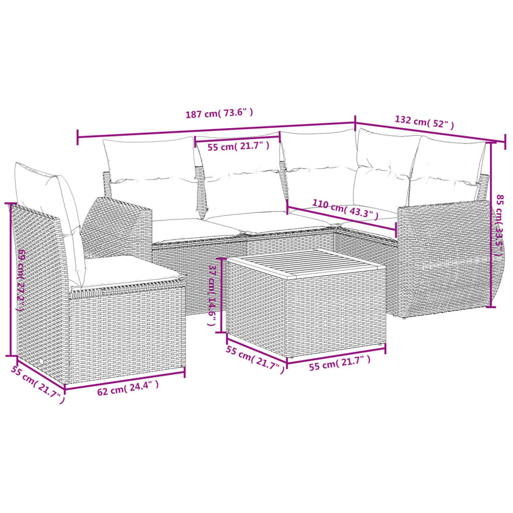 6-delige Loungeset met kussens poly rattan zwart