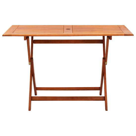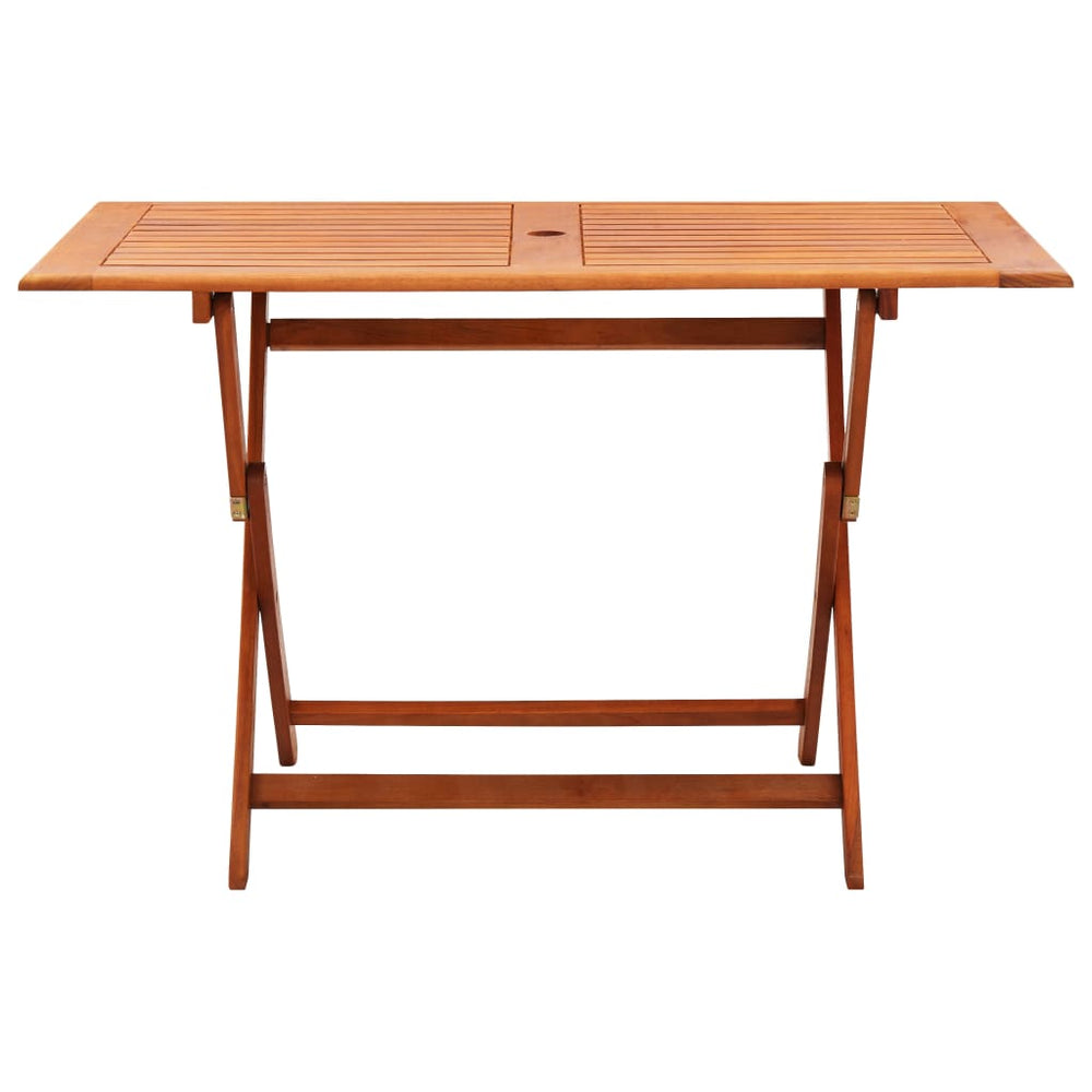 De eethoek is gemaakt van eucalyptushout dat weerbestendig en duurzaam is, wat zorgt voor jarenlang gebruik. Dankzij de olieafwerking is het oppervlak makkelijk schoon te vegen met een vochtige doek. Daarnaast heeft het tafelblad een gat in het midden voor een parasol. De tafel en stoelen kunnen worden ingeklapt om ruimte te besparen wanneer ze niet in gebruik zijn.