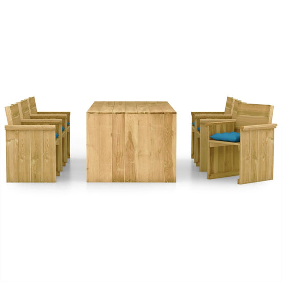 De tafel en stoelen hebben een elegant en tijdloos design en zijn gemaakt van geïmpregneerd grenenhout, waardoor ze duurzaam en weerbestendig zijn. Zet de set in de tuin of op je terras en geniet van je vrije tijd met een boek en een heerlijk kopje koffie De kussens zijn gemaakt van 100% polyester, dat sterk en duurzaam is. Ze zijn geschikt voor zowel binnen- als buitengebruik en bieden een ultrazachte en langdurige zitervaring. De hoogwaardige stiksels aan de randen van het kussen zijn duurzaam en de touwtjes zorgen voor stevige bevestiging aan de zitting.