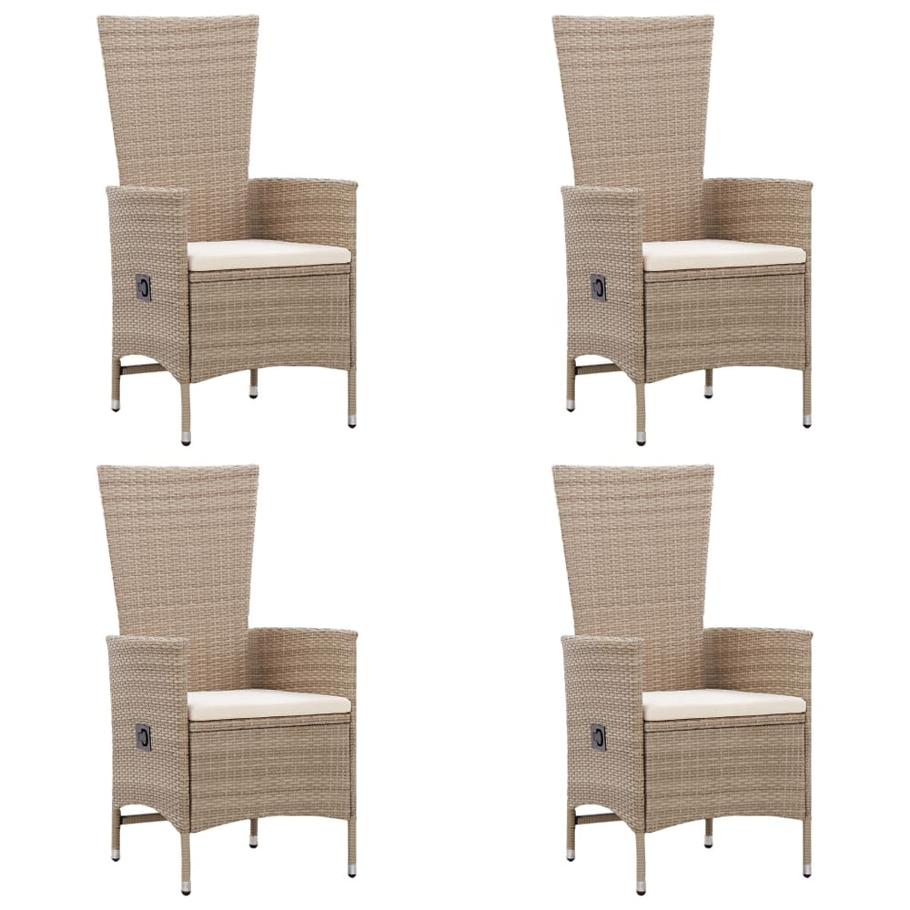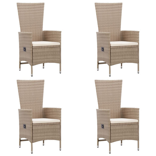 De eettafel is gemaakt van massief acaciahout, waardoor hij stevig en stabiel is. Het met olie afgewerkt oppervlak maakt de tafel geschikt voor buitengebruik. De eetstoelen hebben een stalen frame bedekt met weerbestendig PE-rattan, waardoor ze stevig en eenvoudig te reinigen zijn. De armleuningen zijn gedecoreerd met massief acaciahout voor een rustieke charme. De rugleuning en voetensteun kunnen versteld worden door aan de knop aan de zijkant te trekken. De dik gevoerde kussens bieden extra zitcomfort.