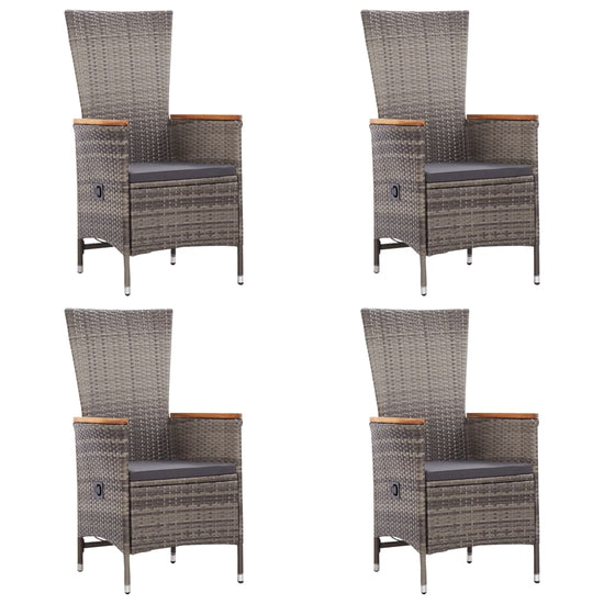 De eettafel is gemaakt van massief acaciahout, waardoor hij stevig en stabiel is. Het met olie afgewerkt oppervlak maakt de tafel geschikt voor buitengebruik. De eetstoelen hebben een stalen frame bedekt met weerbestendig PE-rattan, waardoor ze stevig en eenvoudig te reinigen zijn. De armleuningen zijn gedecoreerd met massief acaciahout voor een rustieke charme. De rugleuning en voetensteun kunnen versteld worden door aan de knop aan de zijkant te trekken. De dik gevoerde kussens bieden extra zitcomfort.