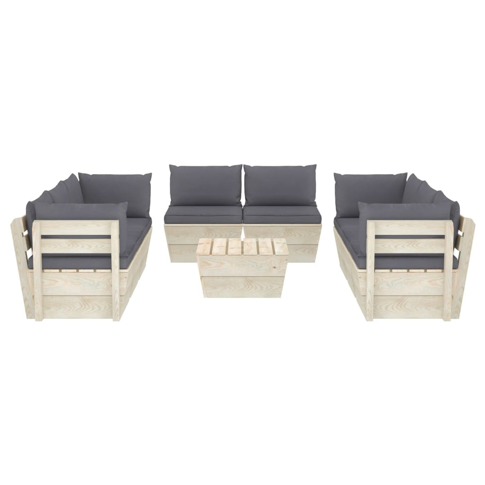 De tuinmeubelset is gemaakt van geïmpregneerd vurenhout waardoor hij duurzaam en stabiel is. Deze set heeft een massieve constructie en vereist weinig onderhoud. Het stevige tafelblad is ideaal om eten en drinken binnen handbereik te houden. Dankzij de 100% polyester bekleding en dikke vulling zijn de palletkussens zacht en zeer comfortabel. Bovendien maakt het modulaire ontwerp het mogelijk om de set in elke gewenste samenstelling te plaatsen.