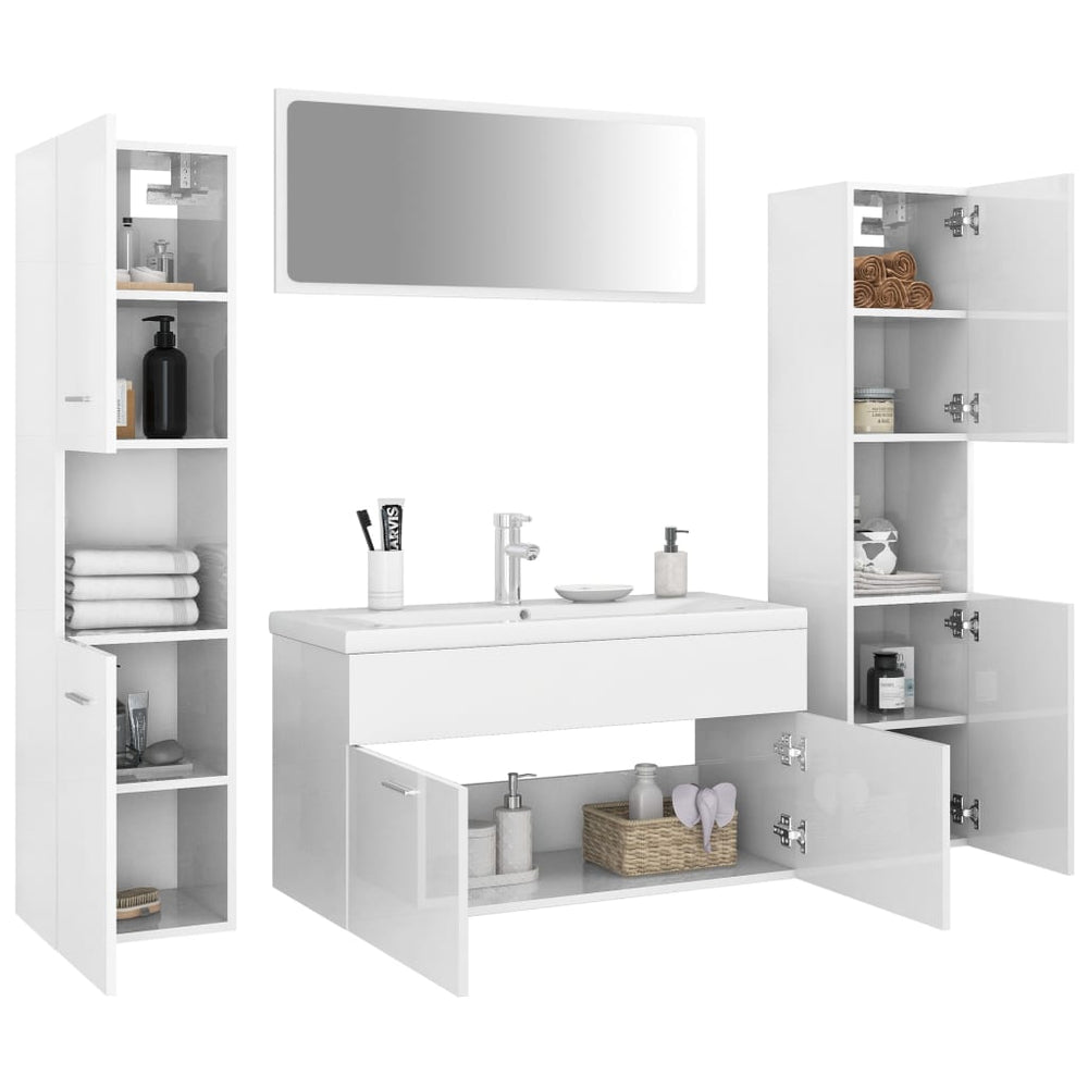 De meubelset bestaat uit een wastafelkast, twee hoge kasten en een spiegel. De chique wastafelkast heeft 1 vak en het bovenblad daarvan is ideaal voor het plaatsen van de wastafel. Elke hoge kast heeft in totaal 5 vakken en 2 deuren, waardoor er voldoende ruimte is om spullen in je badkamer op te bergen. De spiegel geeft je interieur een prachtige uitstraling. Deze badkamerset is gemakkelijk schoon te maken met een vochtige doek.