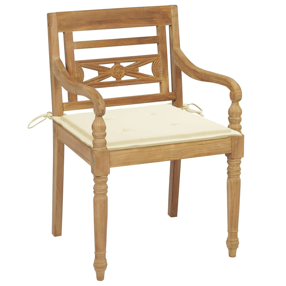 Deze comfortabele en elegante houten Batavia stoelen met kussens zien er prachtig uit in de tuin of op het terras.