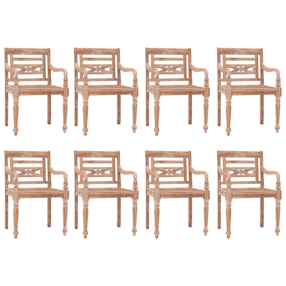 Voeg een vleugje elegantie toe aan je buitenruimte met deze Batavia stoelen. Ze hebben delicate, gebogen armleuningen en decoratief snijwerk op de rugleuning en poten.