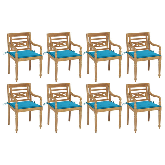 Deze comfortabele en elegante houten Batavia stoelen met kussens zien er prachtig uit in de tuin of op het terras.