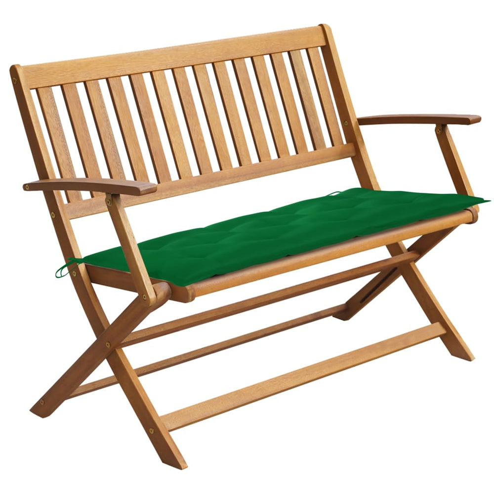 Het tuinbankje is gemaakt van massief acaciahout waardoor het stevig, duurzaam en geschikt voor buitengebruik is. De rugleuning en de armleuningen dragen bij aan het zitcomfort. Het houten bankje kan ingeklapt worden om ruimte te besparen. Het meegeleverde kussen biedt extra zitcomfort. Het is gemaakt van 100% polyester dat behandeld is om het waterdicht te maken. Elk kussen heeft 2 sets touwtjes om het aan de bank te bevestigen.