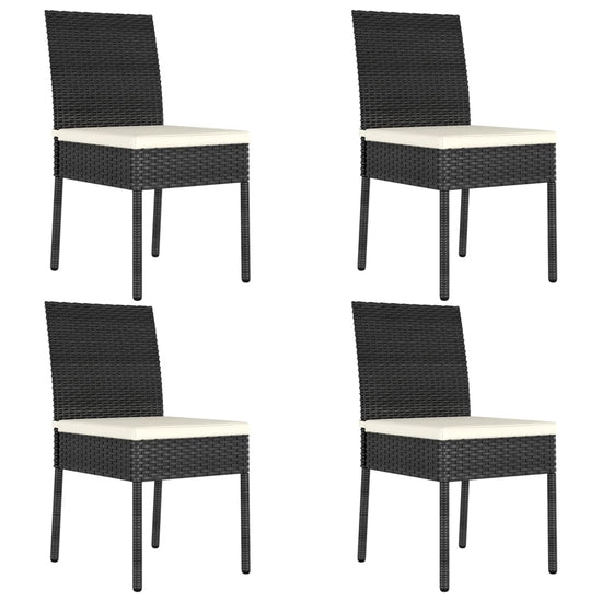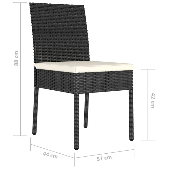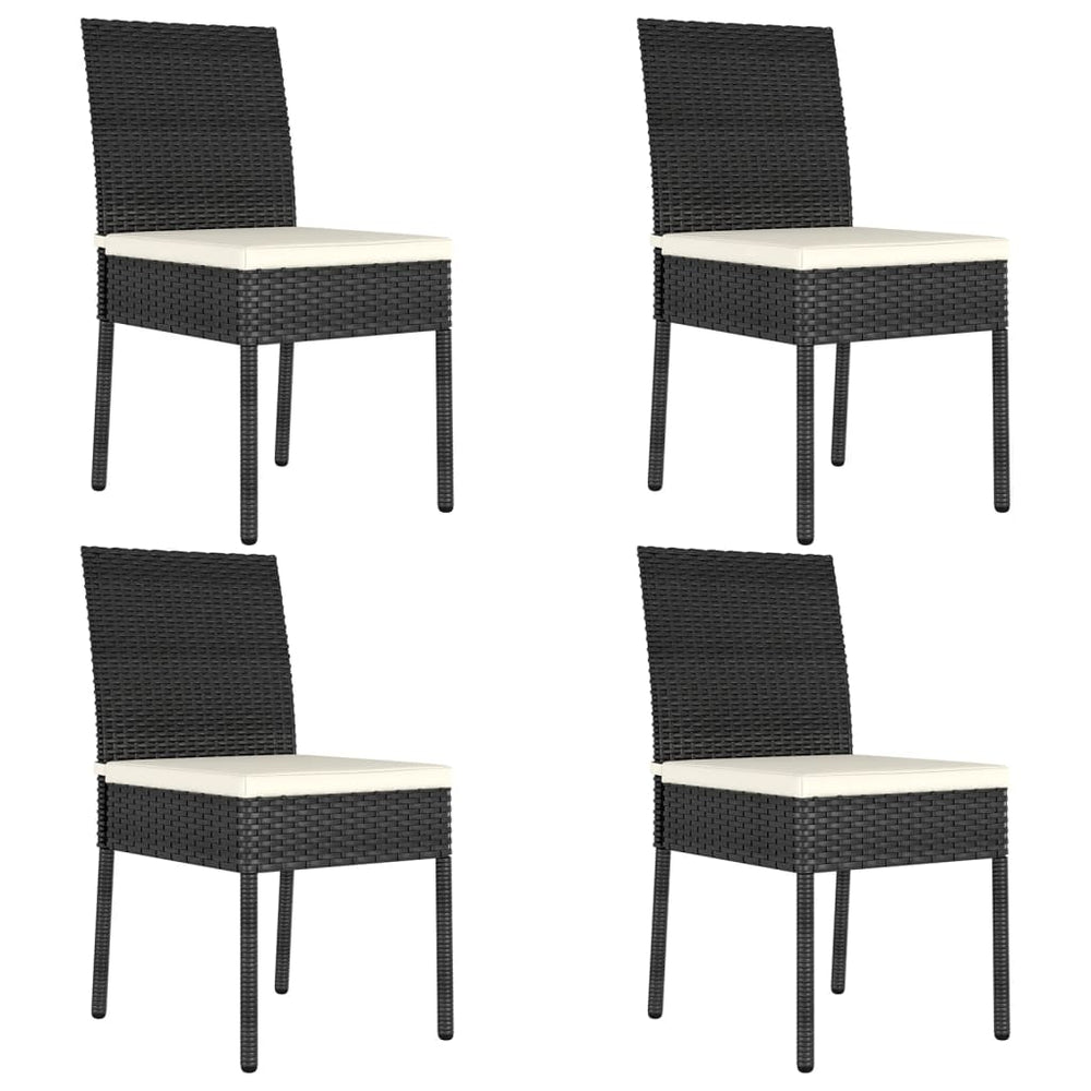De tuinstoelen zijn gemaakt van poly rattan, waardoor ze weerbestendig en gemakkelijk schoon te maken zijn. De zwart gepoedercoat stalen frames zijn stabiel en duurzaam. Dankzij de lichtgewicht constructie is de eetstoel eenvoudig te verplaatsen en geschikt voor buitengebruik. De inbegrepen zitkussens bieden extra zitcomfort.
