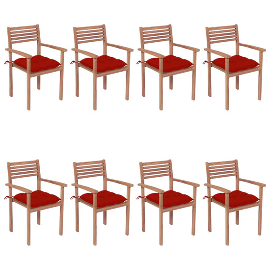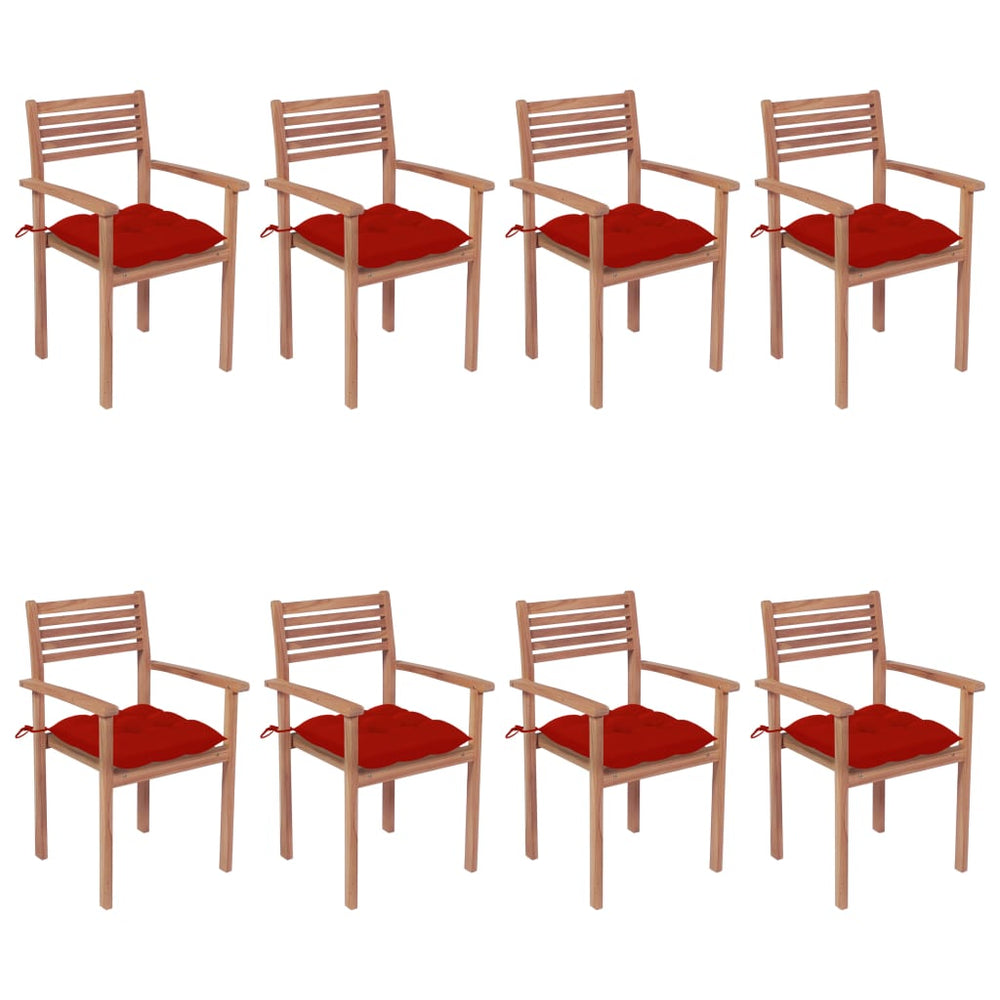 Deze teakhouten set is gemaakt van extreem duurzaam hard teakhout dat gewaterd, in de oven gedroogd en vervolgens fijn geschuurd is om het een zeer glad uiterlijk te geven. Teakhout staat bekend om zijn uitzonderlijke kracht en weerbestendigheid, waardoor het veel geschikter is voor tuinmeubelen dan elke andere houtsoort. Teakhout is de perfecte keuze als je een duurzaam tuinmeubelstuk wilt aanschaffen. Deze stoelen zijn stapelbaar om opbergruimte te besparen wanneer ze niet in gebruik zijn. Ze hebben een mooie afwerking gekregen die het hout een warme kleur geeft. De inbegrepen kussens bieden extra comfort. Elk kussen heeft 2 sets touwtjes voor stevige bevestiging aan de stoel.